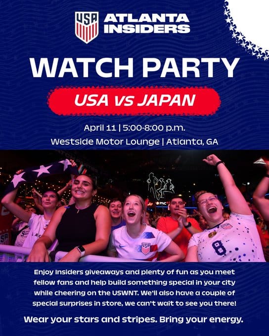 The Atlanta Insiders are hosting a watch party for the USWNT vs. Japan at Westside Motor Lounge Saturday from 5:00 to 8:00 PM, followed by the Atlanta United match from Chicago. Expect giveaways, fellow fans, and a few special surprises along the way. Wear your stars and stripes and bring your energy.